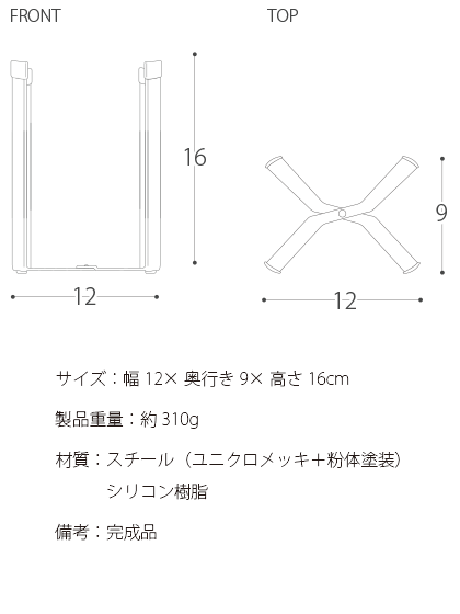 サイズ: 幅12×奥行き9×高さ16cm 製品重量: 約310g 材質: スチール(ユニクロメッキ+粉体塗装) シリコン樹脂 備考: 完成品