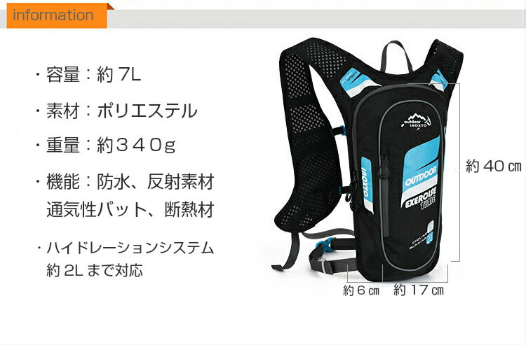 7L RUNNINGバックパック ランニング 給水 ボトルケース マラソン リュック メンズ レディース 軽量タイプ リフレクター 防水 速乾 通気性 防臭 断熱シート付 ※全国一律送料無料 ※ハイドレーションシステムは別売りです。